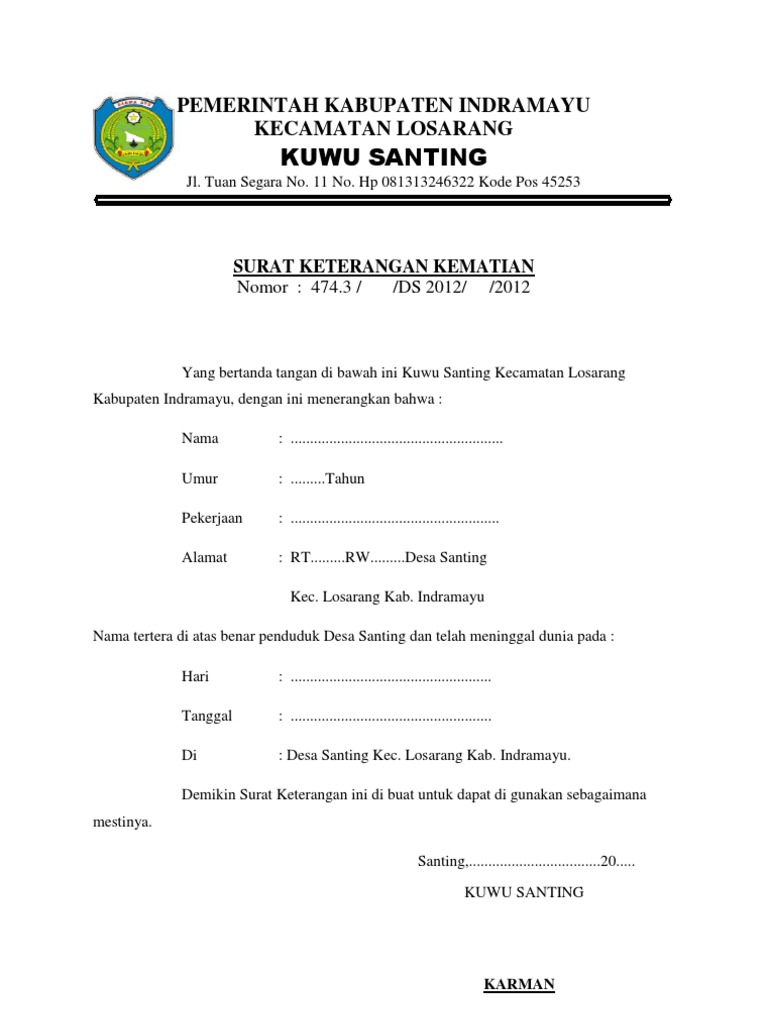 Contoh Surat Keterangan Kematian Dari Kepala Desa Dapatkan Contoh from imgv2-2-f.scribdassets.com Contoh surat kematian dari desa have a graphic from the other.contoh surat kematian dari desa in addition, it will feature a picture of a kind that may be observed in the gallery of contoh surat kematian dari desa. Surat kematian dari rumah sakit jika meninggal di rumah sakit 3. Begitupun dengan manusia juga akan meninggal dunia, dan kita tidak tahu kapan dan. Terkadang, untuk pengurusan pemakaman kita membutuhkan surat keterangan kematian dan biasanya surat yang digunakan untuk pemakaman ini dikeluarkan oleh dokter di rumah sakit, rt atau rw setempat atau bisa dari desa. Contoh surat keterangan kematian dari kepala desa. Fungsi surat kematian untuk kepentingan pemakaman. Contoh surat keterangan usaha dari kepala desa kumpulan surat penting. Pemerintah kabupaten bandung barat kecamatan lembang desa sukajaya alamat :